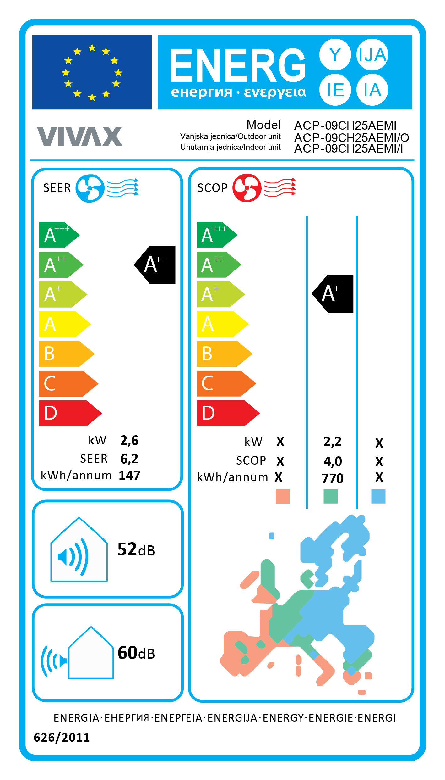 | Funkcije | Isušivač preostale vlage, Pokretanje pri niskom naponu, Zaštita ventila vanjske jedinice, WiFi ready |